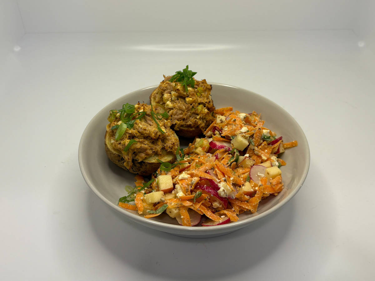 Salat auf tiefen Tellern verteilen, Thunfisch-Kumpir daneben anrichten und alles mit grünem Teil der Frühlingszwiebel toppen.