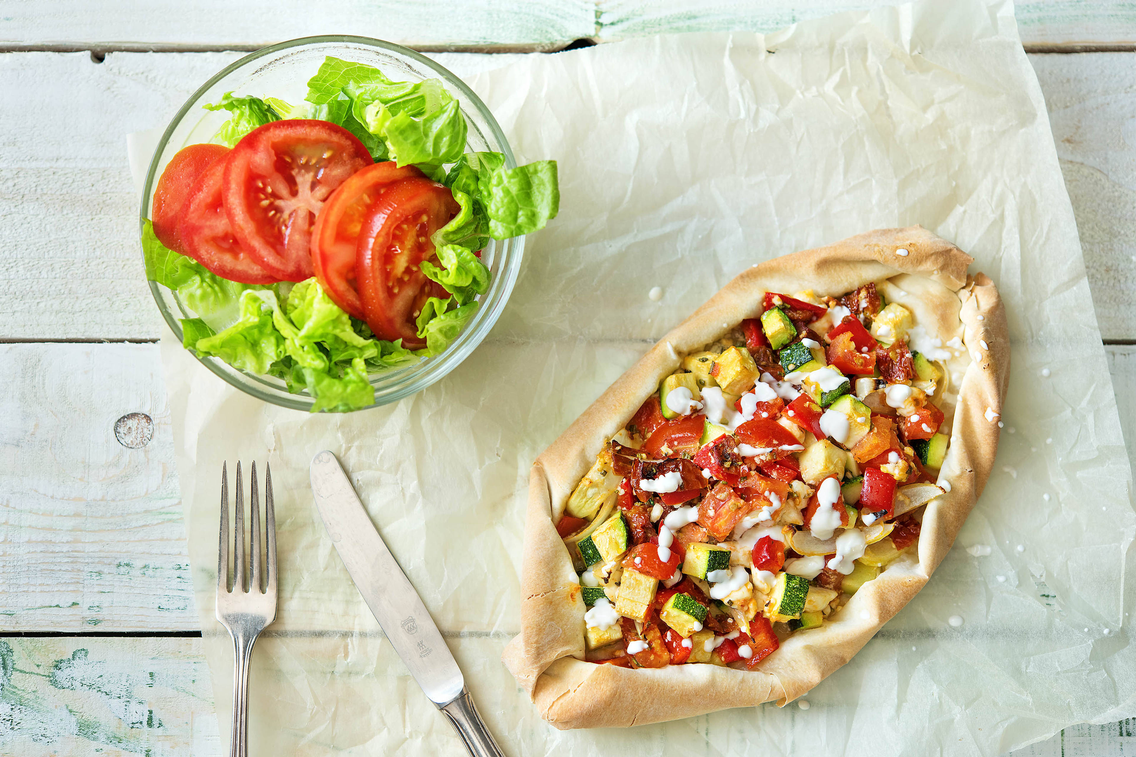2 Blätter Filoteig nebeneinander legen und dünn mit Olivenöl* bestreichen. 2 weitere Teigblätter darauflegen und ebenfalls dünn mit Olivenöl* bestreichen. Den Rest Filoteig brauchst Du nicht mehr.