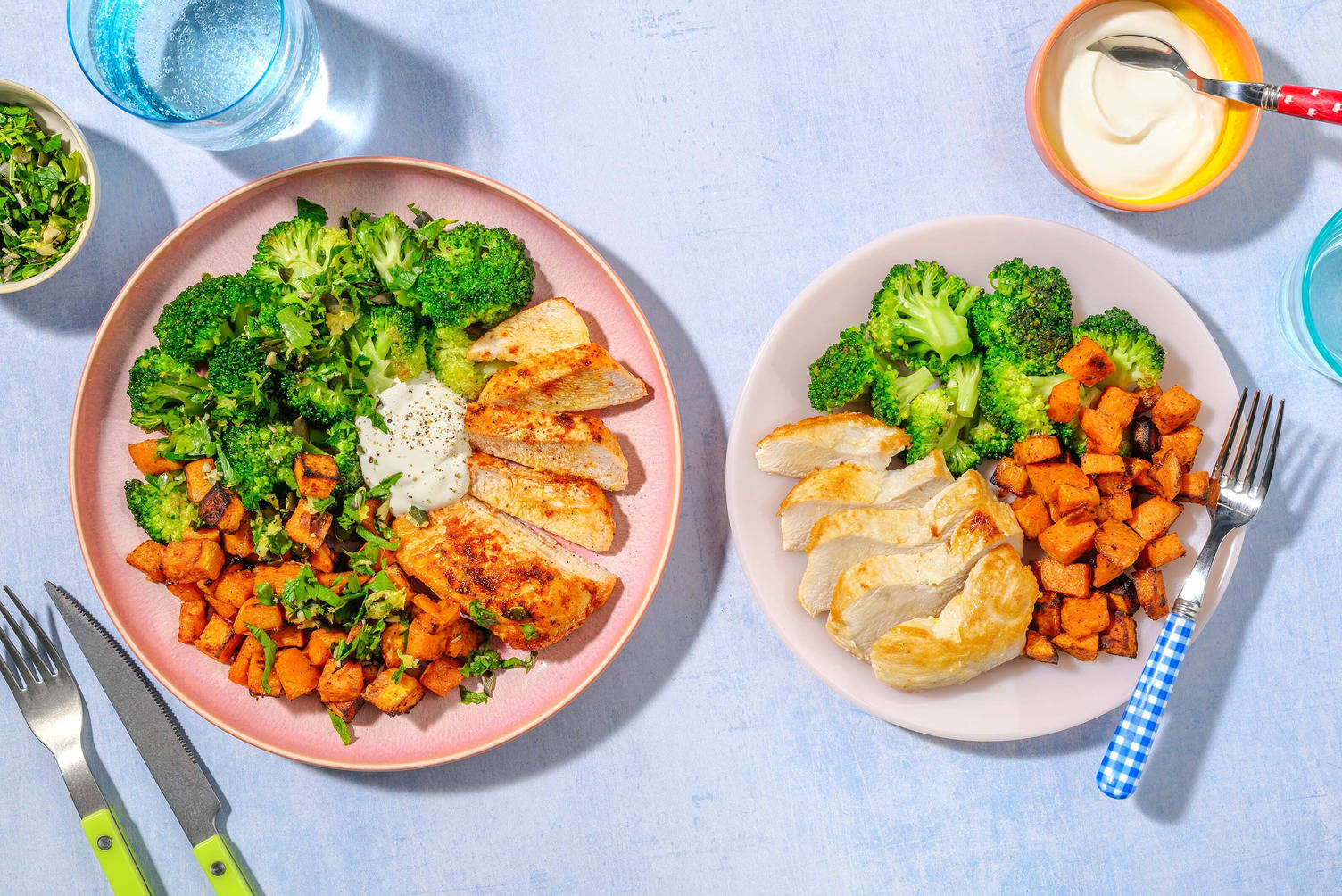 Kräuter-Quinoa auf Teller verteilen. Hähnchen und Brokkoli dazu reichen.