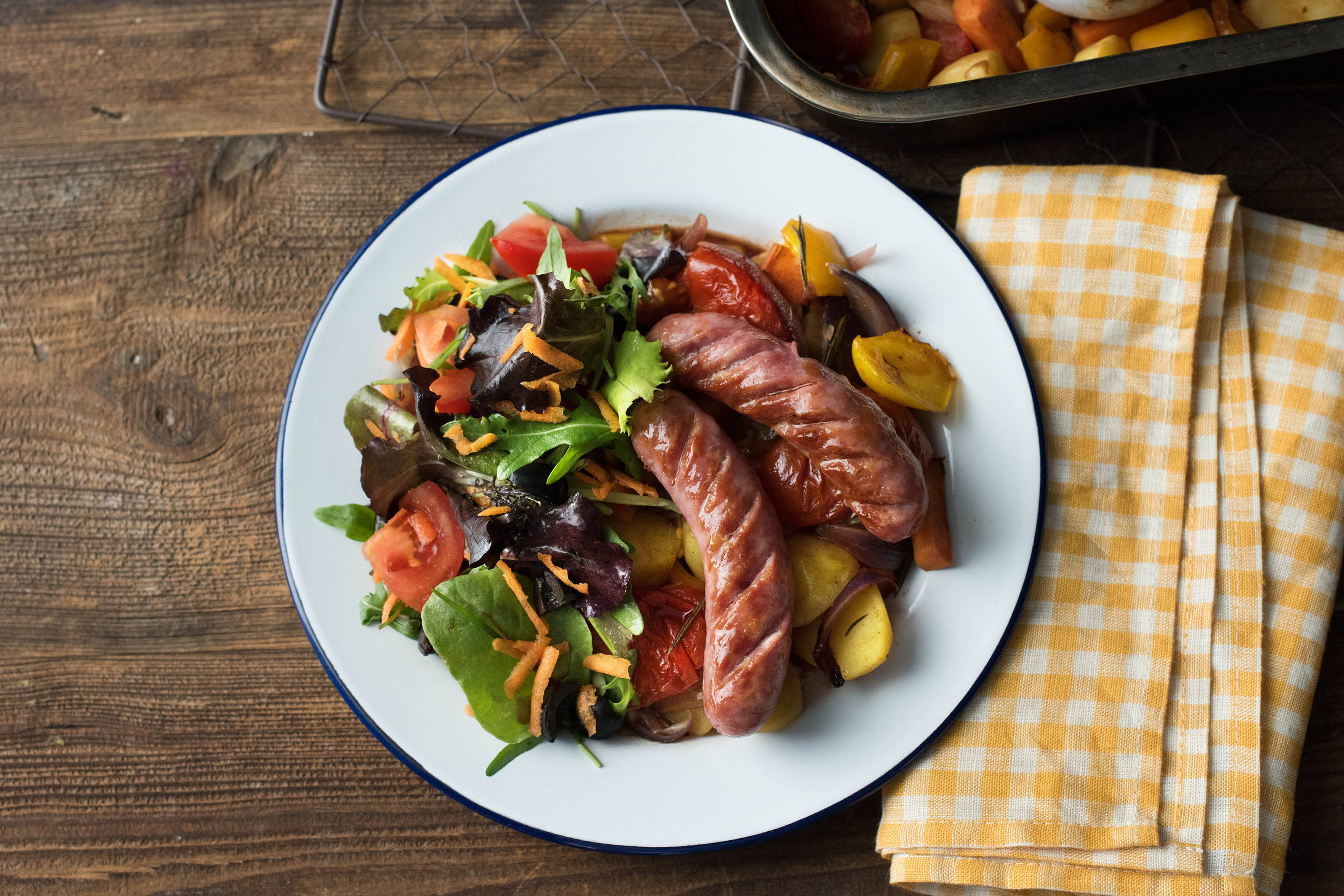 Rindersteak mit der Soße auf Teller verteilen. Rosenkohl und Rosmarin-Kartoffeln daneben anrichten.