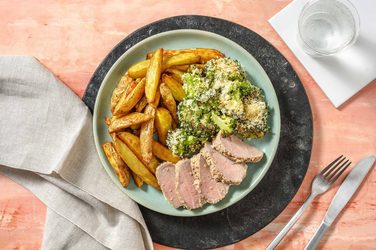Gebackene Kartoffeln, Brokkoli und Schweinefilets auf Tellern anrichten und genießen. Guten Appetit!