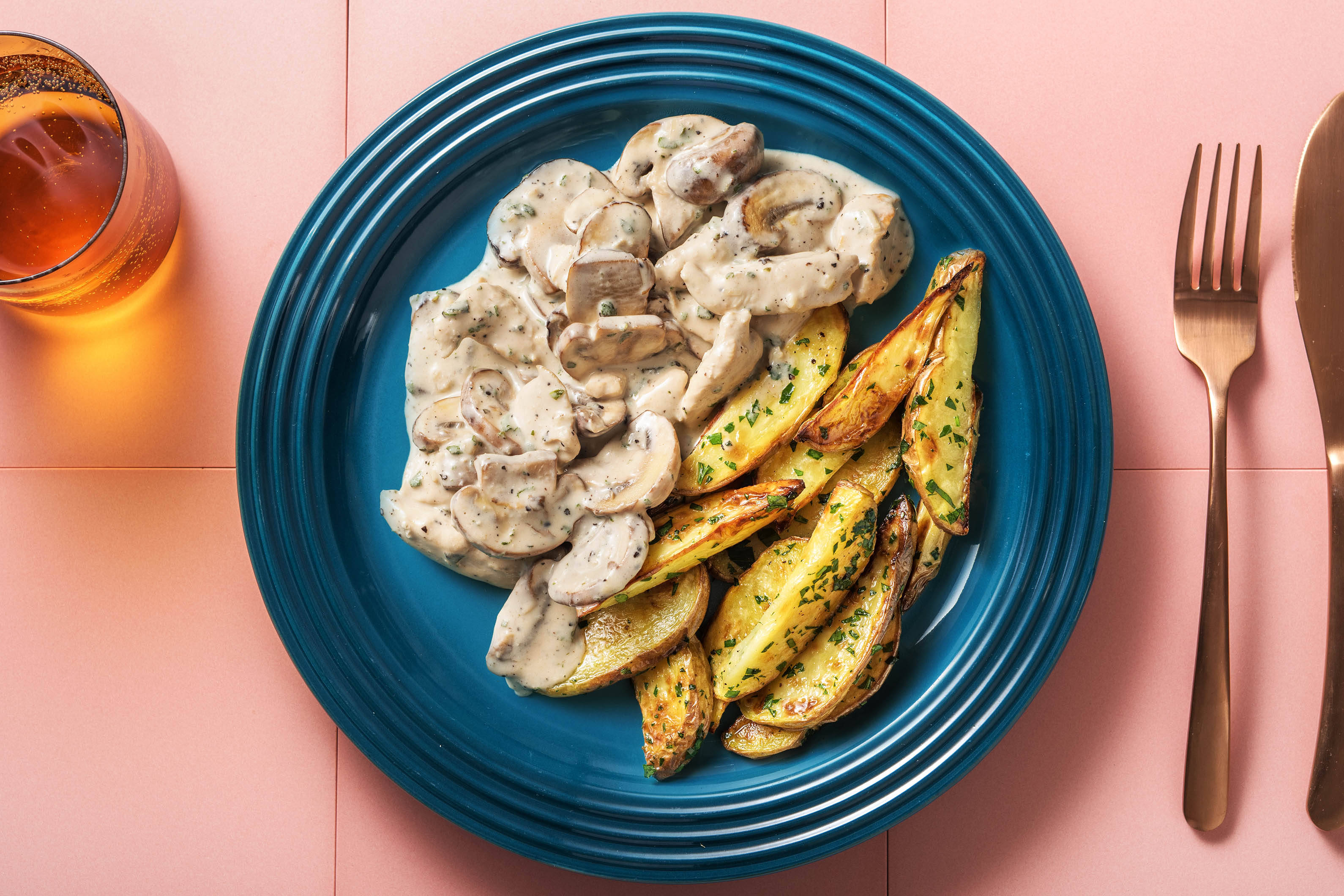 Stampf, Blitzhähnchen und Salat nebeneinander auf Teller verteilen.