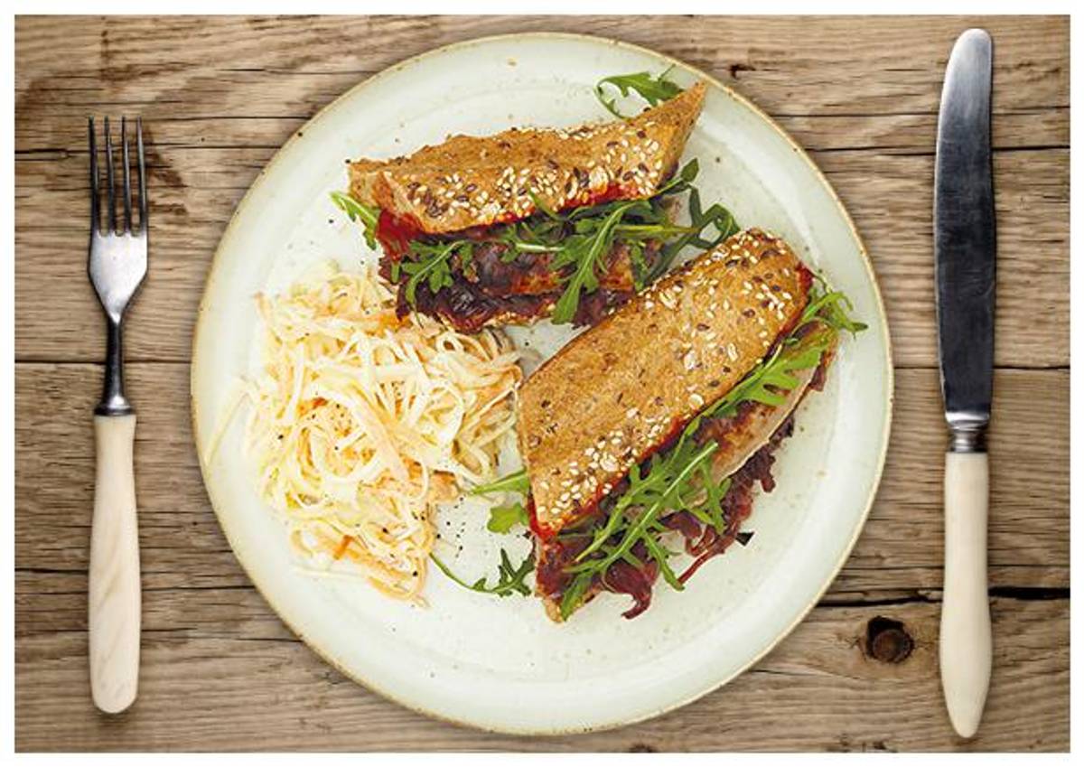 mit Rucola und karamellisierten Zwiebeln dazu selbstgemachten Coleslaw