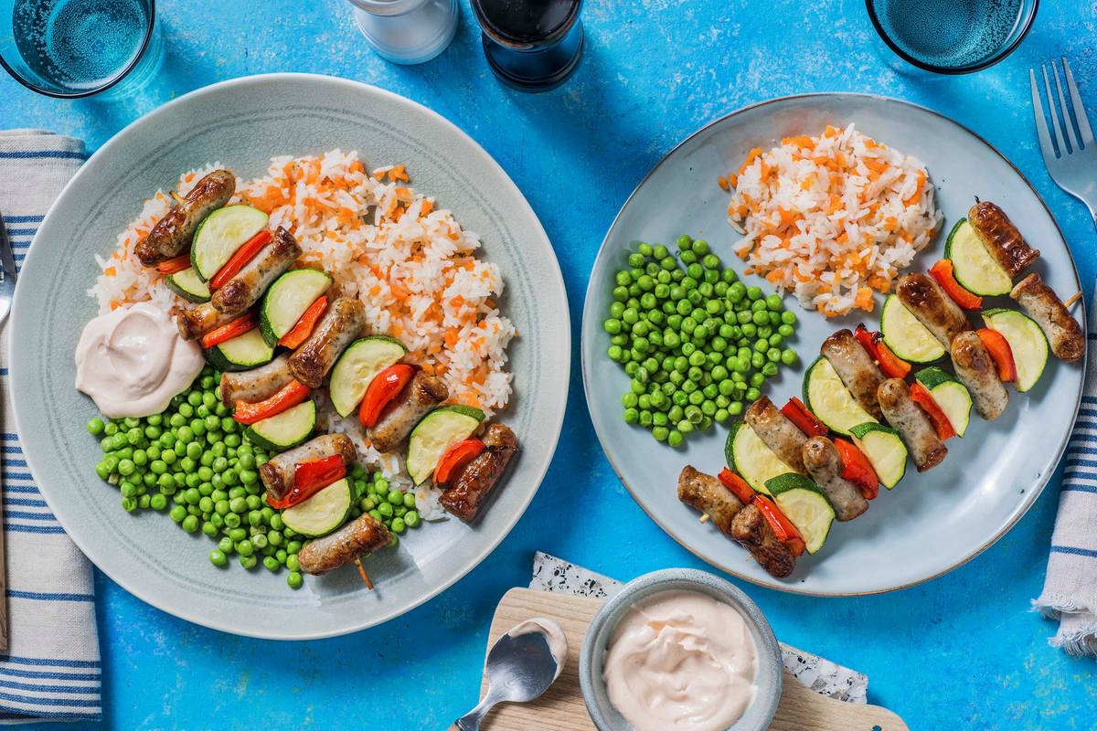 Reis mit einer Gabel etwas auflockern und auf Tellern verteilen. Erbsen und Spieße dazu anrichten und mit dem Dip servieren.