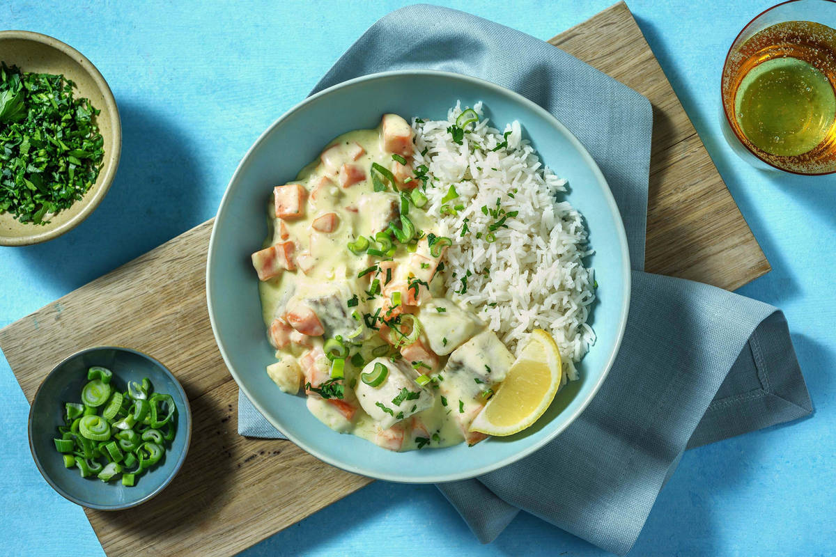 Das Frikassee nach Belieben mit Worcester Sauce und etwas Zitronensaft abschmecken. Basmatireis nach Ende der Kochzeit mit einer Gabel etwas auflockern und auf Tellern anrichten. Seelachsfrikassee daneben anrichten. Nach Belieben mit den grünen Frühlingszwiebelringen und Petersilie bestreuen, Zitronenspalten dazureichen und genießen. Guten Appetit!