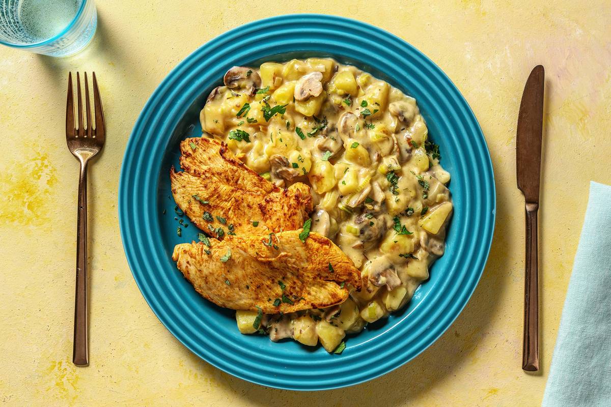 Anschließend das Gemüse in der ersten Pfanne mit Kochsahne, 100 ml [150 ml | 200 ml] Wasser* und Hühnerbrühpulver ablöschen und 3 – 5 Min. auf mittlerer Stufe weiterköcheln lassen, bis das Gemüse weich ist. Mit Salz* und Pfeffer* würzen. Käse hinzugeben und vermengen.