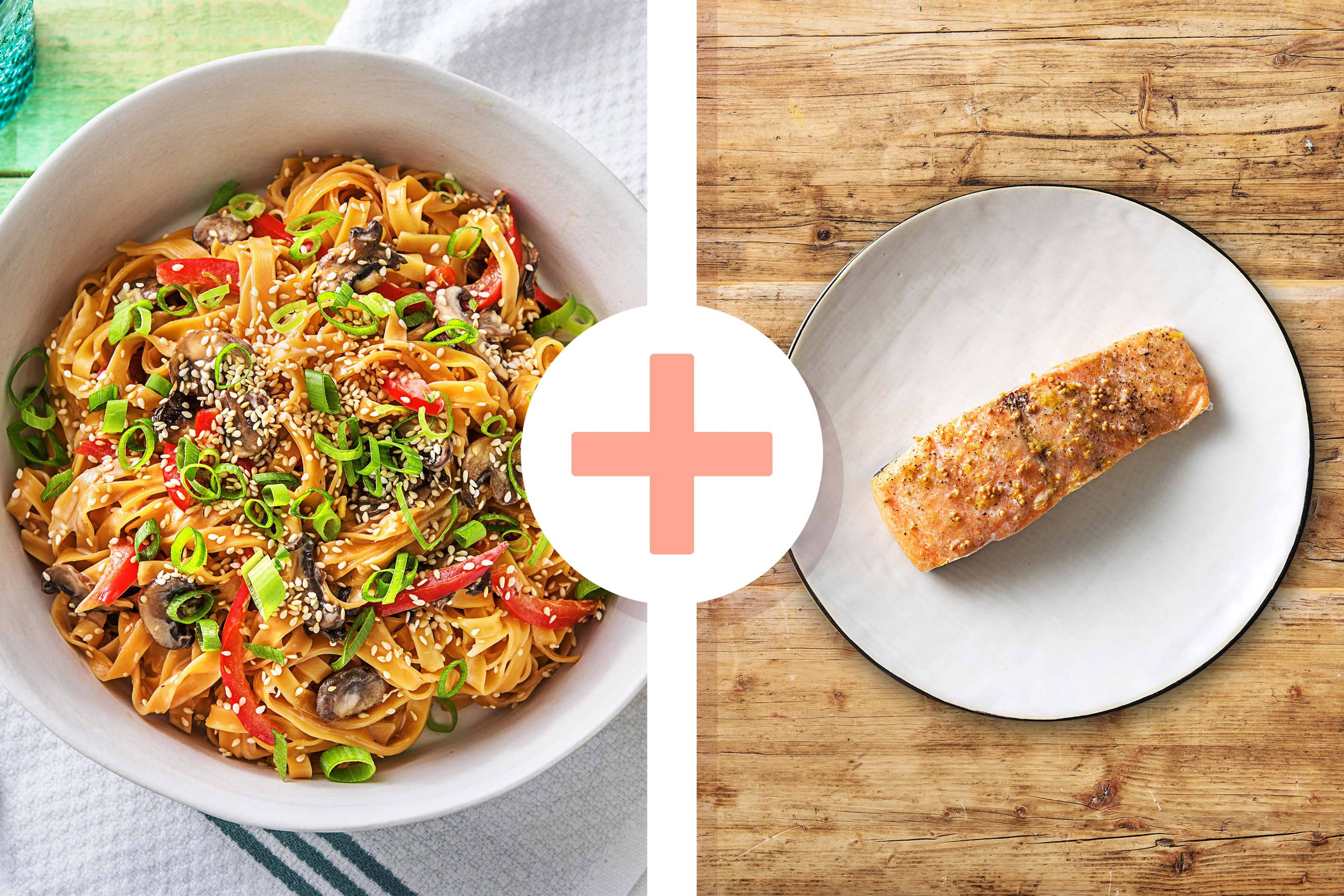 In einer großen Pfanne 1 EL [1,5 EL | 2 EL] Öl* erhitzen. Lachsfilets mit Salz* würzen, mit der Hautseite in die Pfanne geben und 3 – 4 Min. goldbraun anbraten.