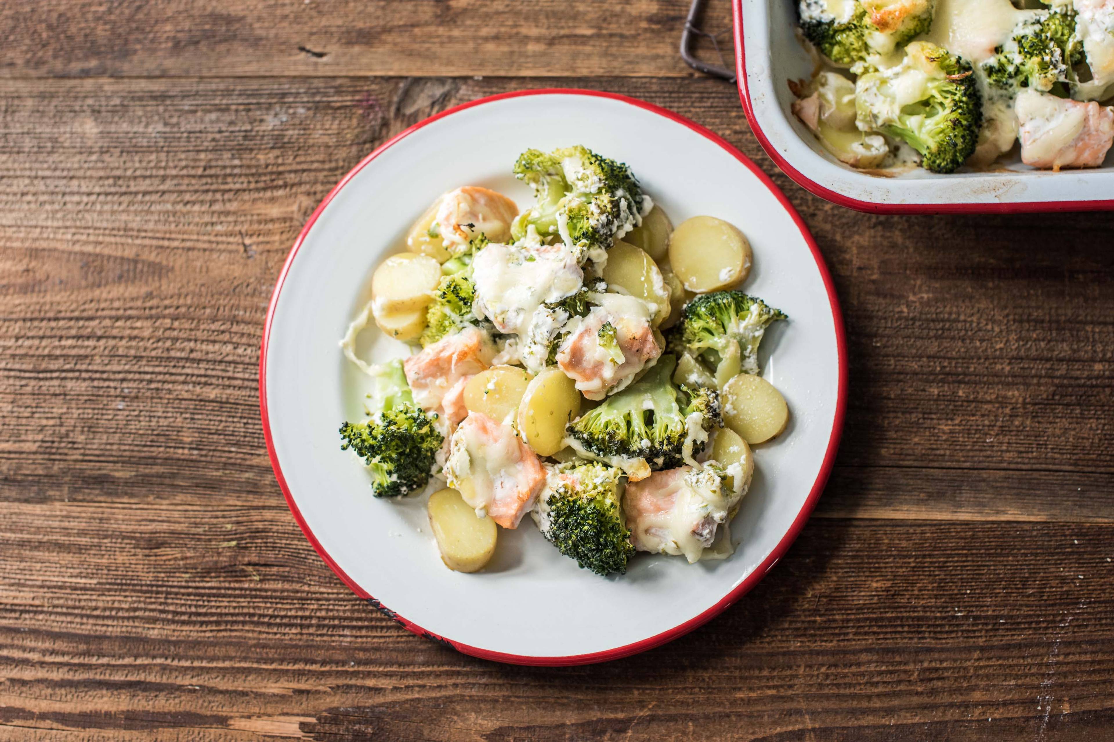 Lachs anschließend mit der Hautseite nach oben neben die Kartoffel geben und die restlichen 8 – 10 Min. mitgaren.