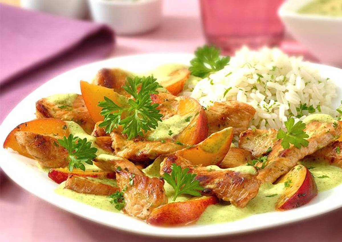 mit gebratenen Hähnchenbruststreifen und Chili-Reis