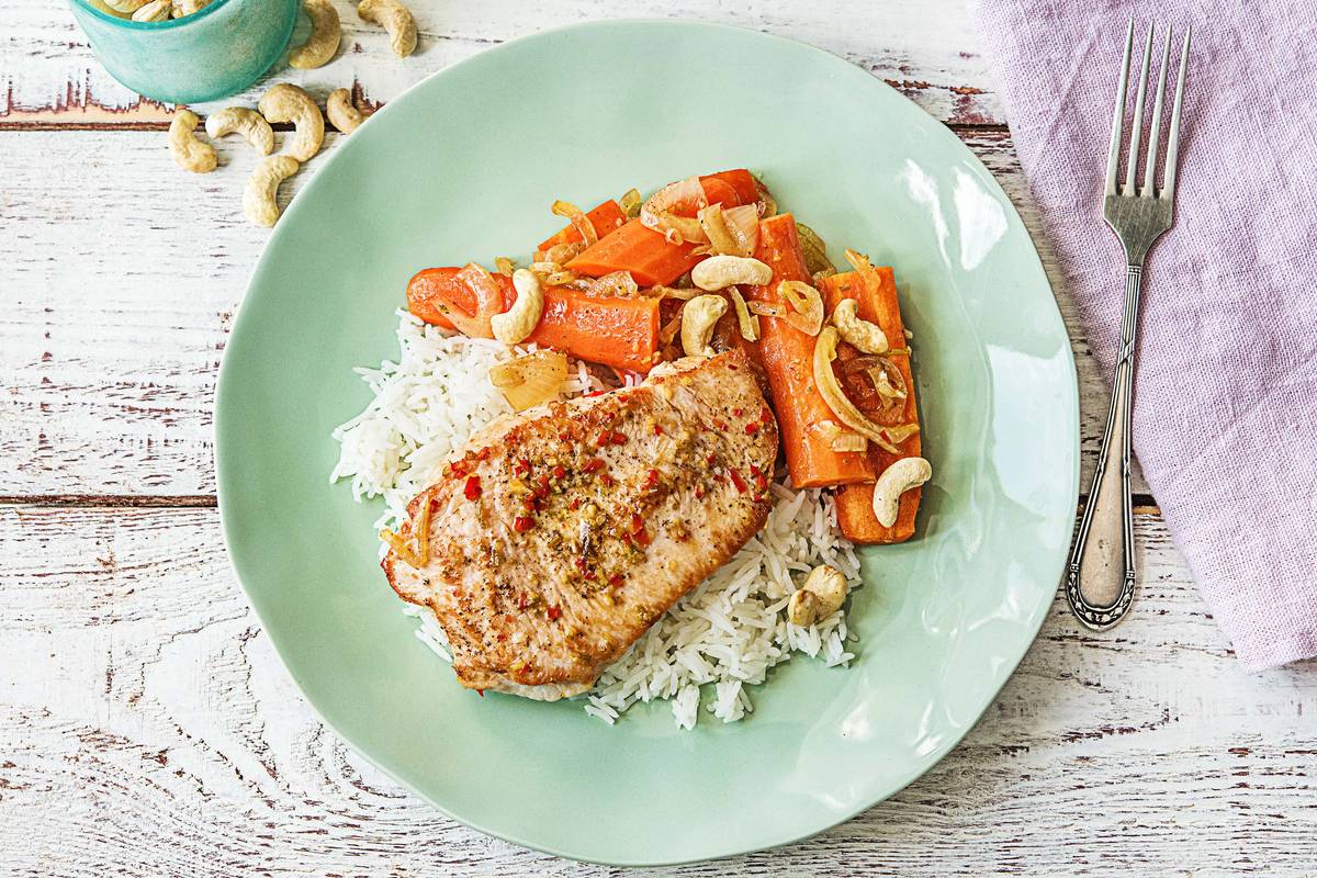 Cashewkerne sind kleine Kraftpakete mit viel Magnesium und Eiweiß bei einem recht geringen Fettgehalt. Ideal zum Snacken. In diesem Gericht sorgen die Kerne mit ihrem cremig-buttrigen Geschmack für eine fernöstliche Note. Mit der pikant-gewürzten Putenbrust, den zarten Ofenkarotten und dem fluffigen Basmatireis wird dies vielleicht Dein neues Lieblingsgericht. Guten Appetit bei diesem scharfen, protein- und ballaststoffreichen Gericht!