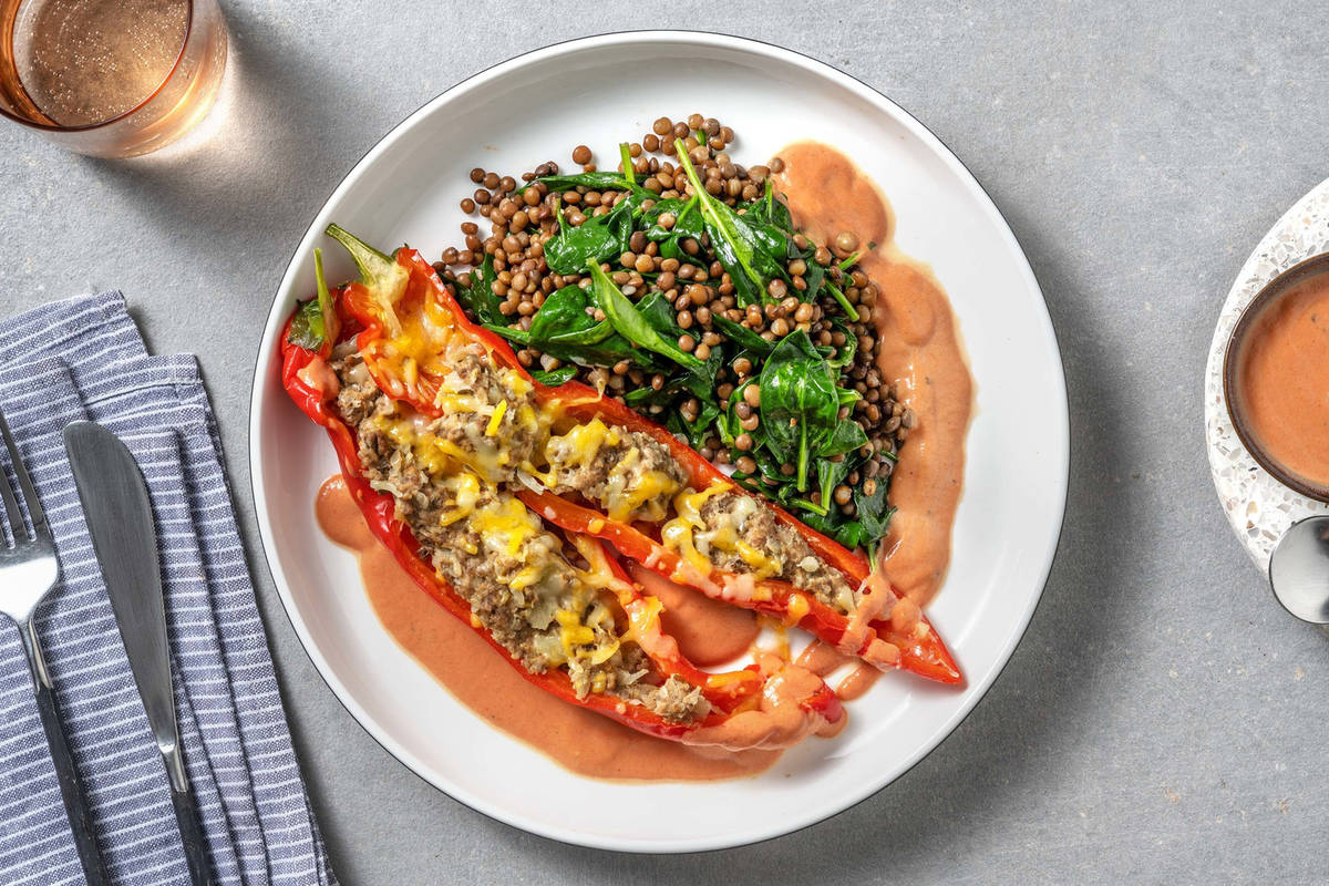 Hackfleisch, die Hälfte der Paprika-Gewürzmischung, Salz* und Pfeffer* zugeben und 10 Sek./Reverse/Stufe 5 vermischen. Paprika mit Hackfleisch füllen. Varoma-Einlegeboden in den Varoma-Behälter einsetzen und Varoma verschließen. 450 g Wasser* in den Mixtopf geben, Varoma aufsetzen und 25 Min./Varoma/Stufe 1 dampfgaren. Währenddessen Linsen durch den Gareinsatz abgießen.