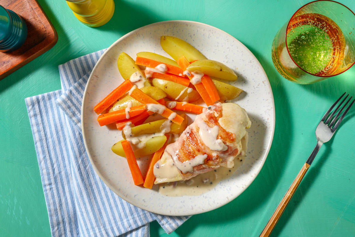 Varoma abnehmen. Gareinsatz mit dem Spatel herausnehmen und Kartoffeln und Gemüse warm halten. In einer großen Pfanne 1 EL [1,5 EL | 2 EL] Öl* erhitzen. Hähnchenbrust in die Pfanne geben und rundherum ca. 1 Min. braten, bis der Bacon knusprig ist. Hähnchenbrust herausnehmen und kurz beiseitestellen.