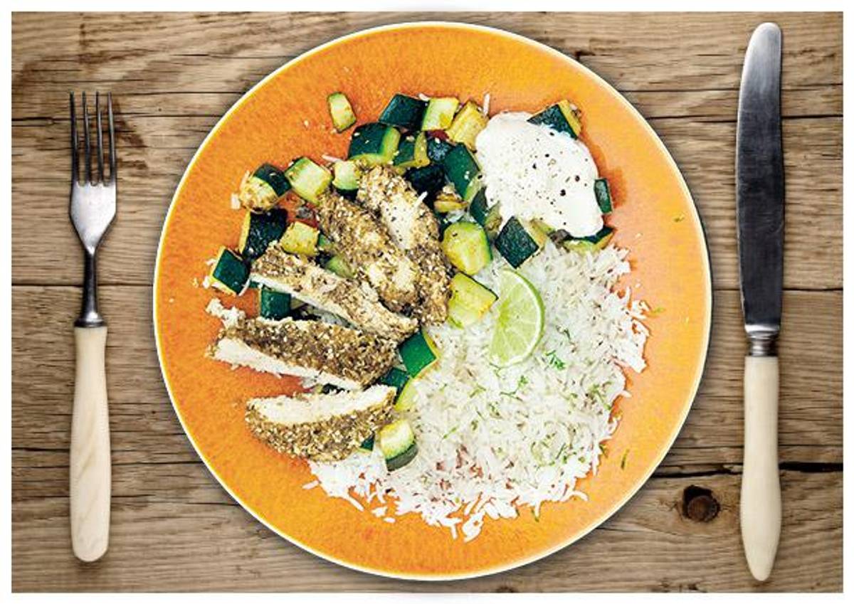 serviert auf fluffigem Basmatireis mit Limetten-Schmand und gebratener Zucchini
