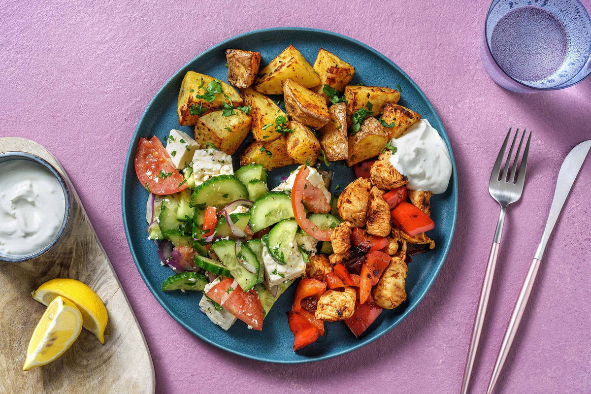 Heize den Backofen auf 220 °C Ober-/Unterhitze (200 °C Umluft) vor. Zitrone halbieren, eine Hälfte entsaften und Saft in eine große Schüssel füllen. Die andere Hälfte in 4 [4 | 8] Spalten schneiden. Hähnchenbrust in ca. 2 cm große Stücke schneiden. In einer großen Schüssel Fleisch mit Zitronensaft, der Hälfte der Gewürzmischung „Hello Mezze“, etwas Salz* und Pfeffer* marinieren. Beiseitestellen.