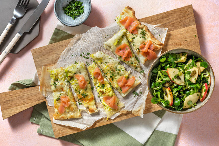 Hähnchenfilets in Streifen schneiden. Parmesan in eine kleine Schüssel reiben. In einer kleinen Schüssel Crème fraîche mit 100 ml [200 ml] warmem Wasser verrühren und mit Salz und Pfeffer abschmecken. Porree in feine Ringe schneiden.