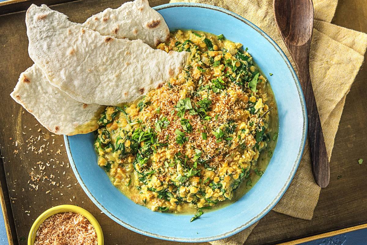 Pfanne erneut erhitzen und Kokos-flocken darin für 1 Min. anrösten, bis sie hellbraun sind. Linsen-Spinat-Dal auf tiefen Tellern anrichten und mit gehacktem Koriander und gerösteten Kokosflocken bestreuen. Chapatis dazu reichen und genießen.
