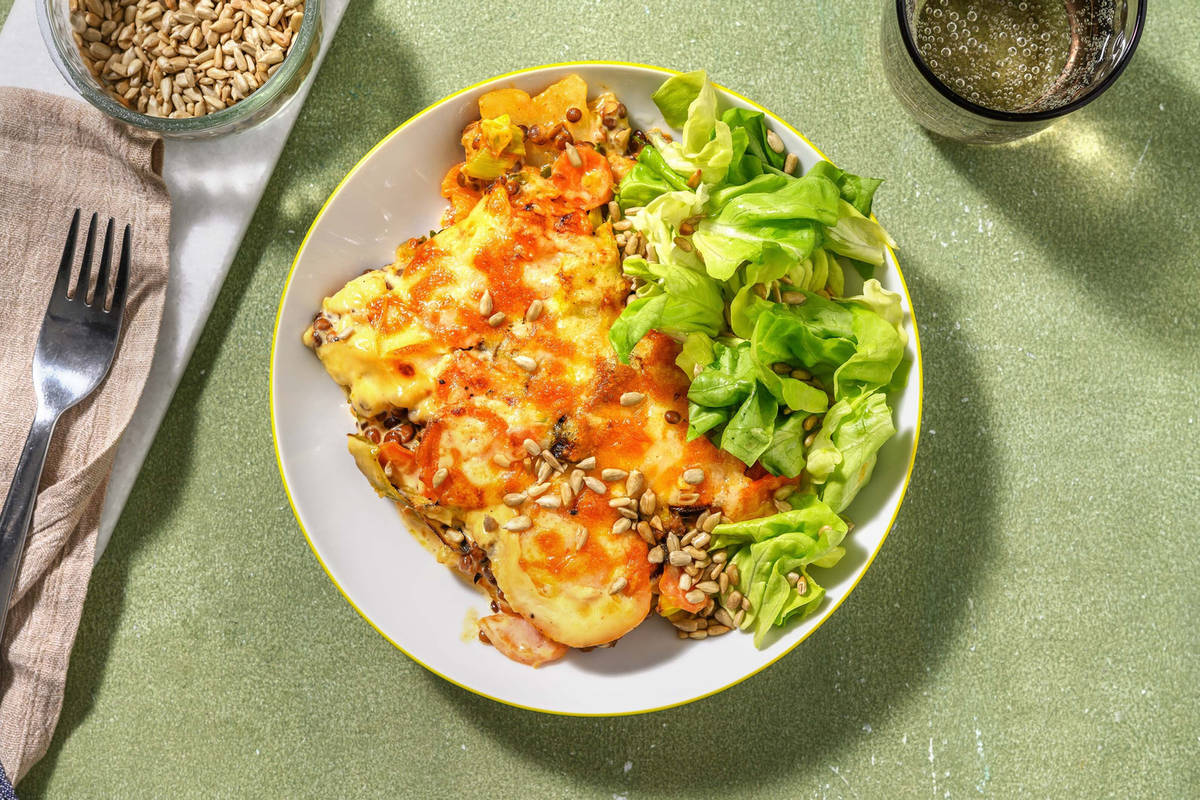 Auflauf aus dem Ofen holen und kurz abkühlen lassen. Salat mit dem Dressing verrühren, Sonnenblumenkerne zugeben und genießen. Guten Appetit!