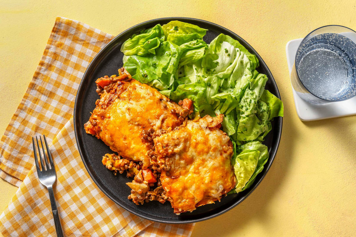 Herzhafter Linsenauflauf mit Käsehaube