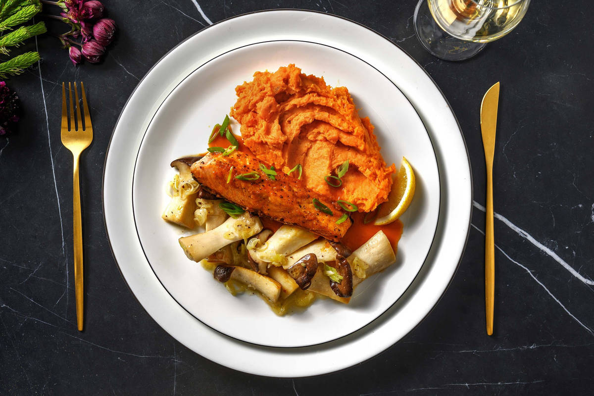 Honig-Lachsfilet auf Ingwer-Miso-Süßkartoffelpürree