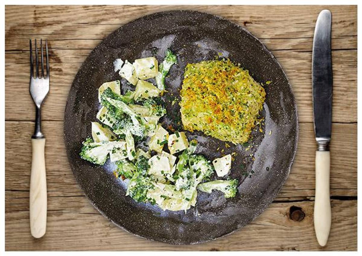 mit Frischkäsefüllung dazu Kartoffeln und Brokkoli, garniert mit Petersilie