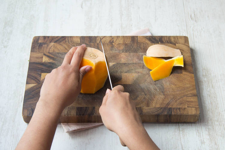 Butternuss-Kürbis schälen und in ca. 2 cm große Würfel schneiden. Zucchini waschen und in ca. 1 cm dicke Scheiben schneiden. Paprika waschen, halbieren, Kerngehäuse entfernen und in feine Spalten schneiden. Zwiebel abziehen und fein hacken.