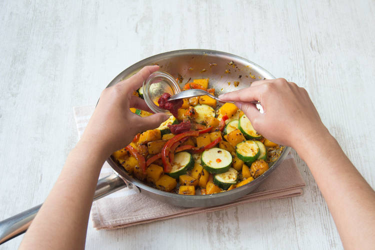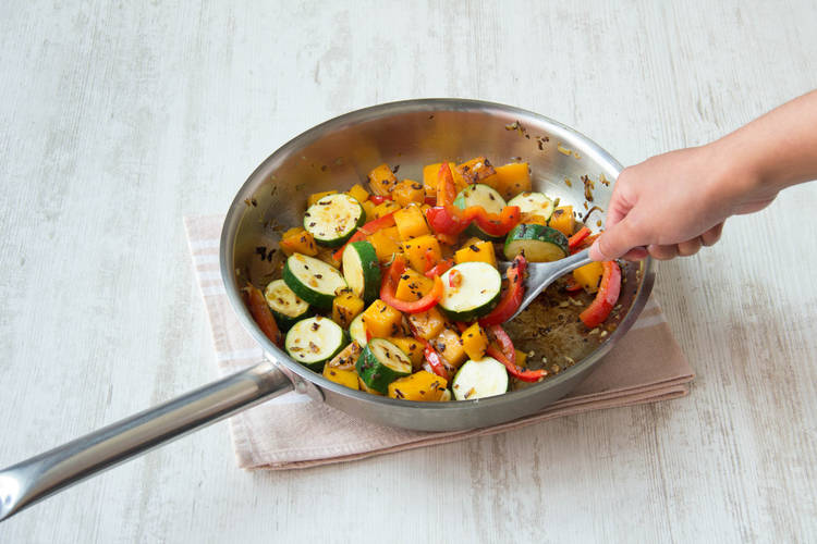 In einer großen beschichteten Pfanne ½ EL Öl erhitzen. Zwiebel darin ca. 2-3 Min. glasig andünsten. Butternuss-Kürbiswürfel zugeben und ca. 5 Min. scharf anbraten. Zucchini und Paprika hinzufügen und ca. 5 Min. weiterbraten.