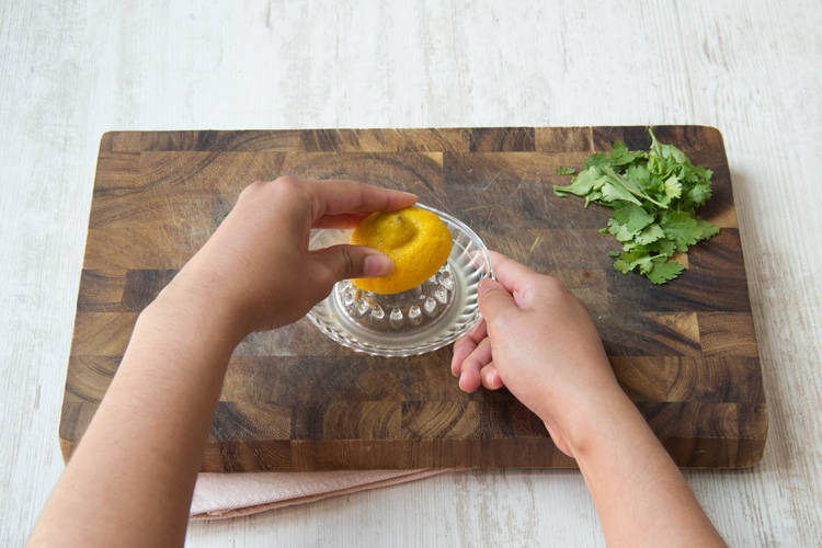 Naan-Brote nach Packungsangabe im Backofen aufbacken. Koriander waschen, trockenschütteln, Blätter abzupfen und klein schneiden. Zitrone entsaften.