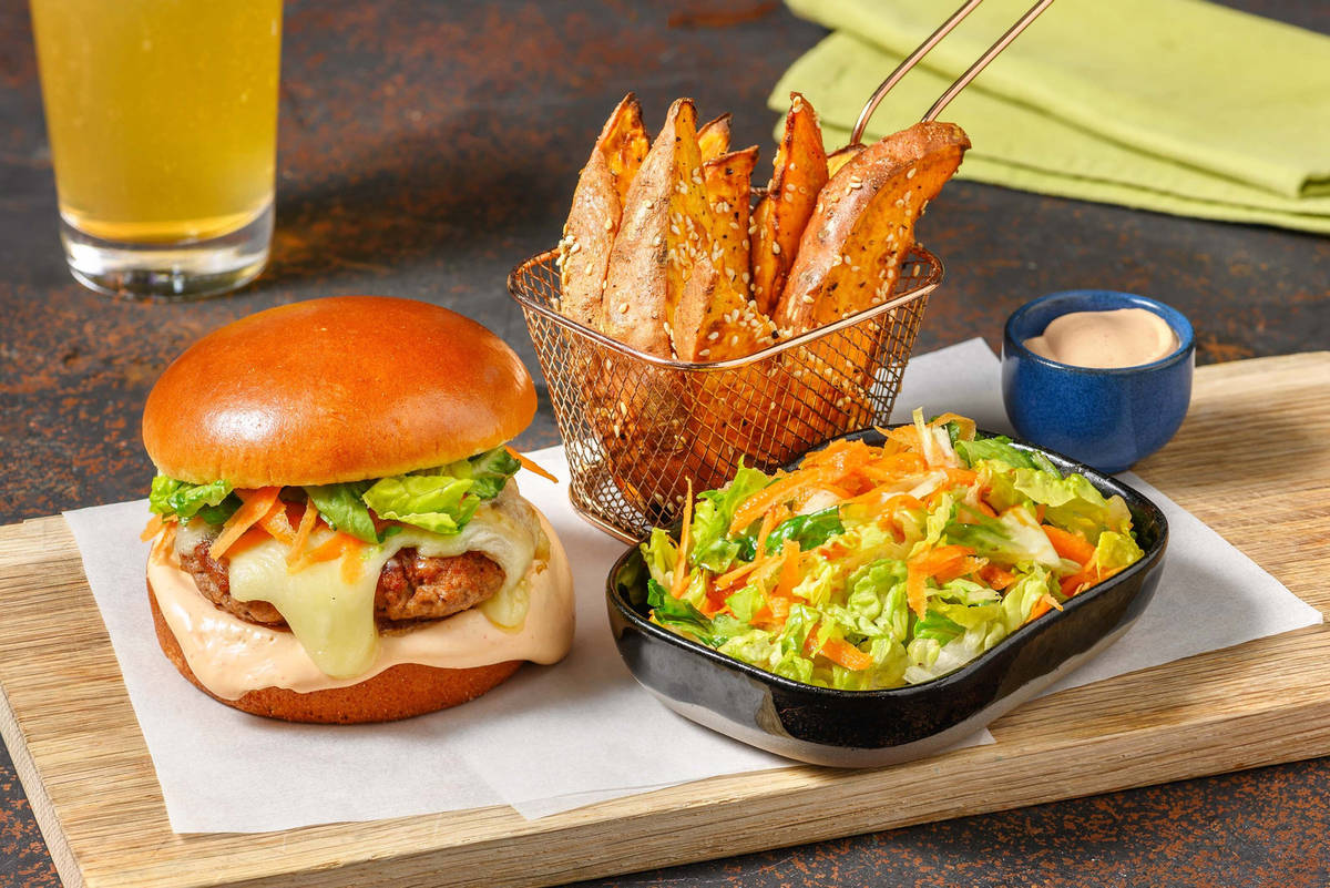 Brötchenunterseiten mit einem Klecks Sriracha-Dip bestreichen. Zuerst mit den Patties belegen, dann mit etwas Salat toppen. Fertige Burger zusammen mit Süßkartoffelwedges, restlichem Salat und restlichem Dip genießen. Guten Appetit!