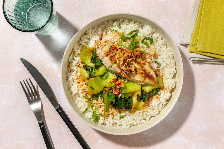 Deckel wieder abnehmen, Gemüse mit restlicher Sojasoße, 1 EL Weißwein-Essig und Sweet Chili-Soße ablöschen. Geriebenen Ingwer, Gewürzmischung, zerkleinerte Pak Choi-Blätter und angebratene Tofuwürfel dazugeben, Deckel wieder aufsetzen, und ca. 1 Min. etwas einköcheln lassen. Mit Salz und Pfeffer abschmecken.