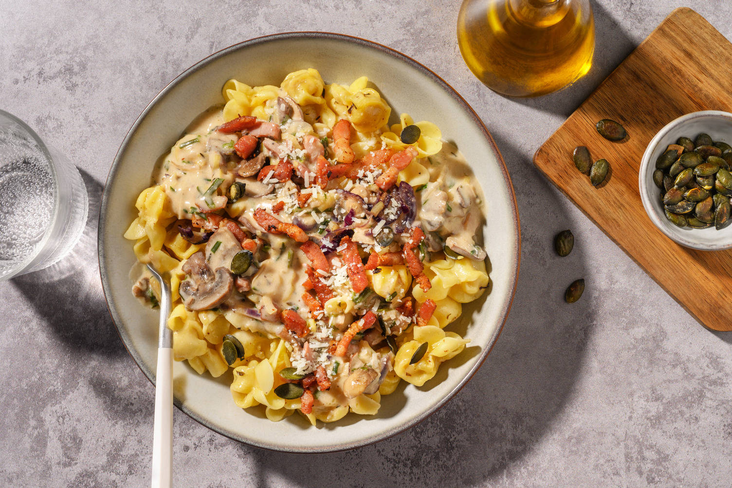 1 EL Butter und 1 EL Öl in einer großen Pfanne erwärmen. Knöpfle darin 3-5 Min. kross anbraten, anschließend in einer Schüssel beiseitestellen.