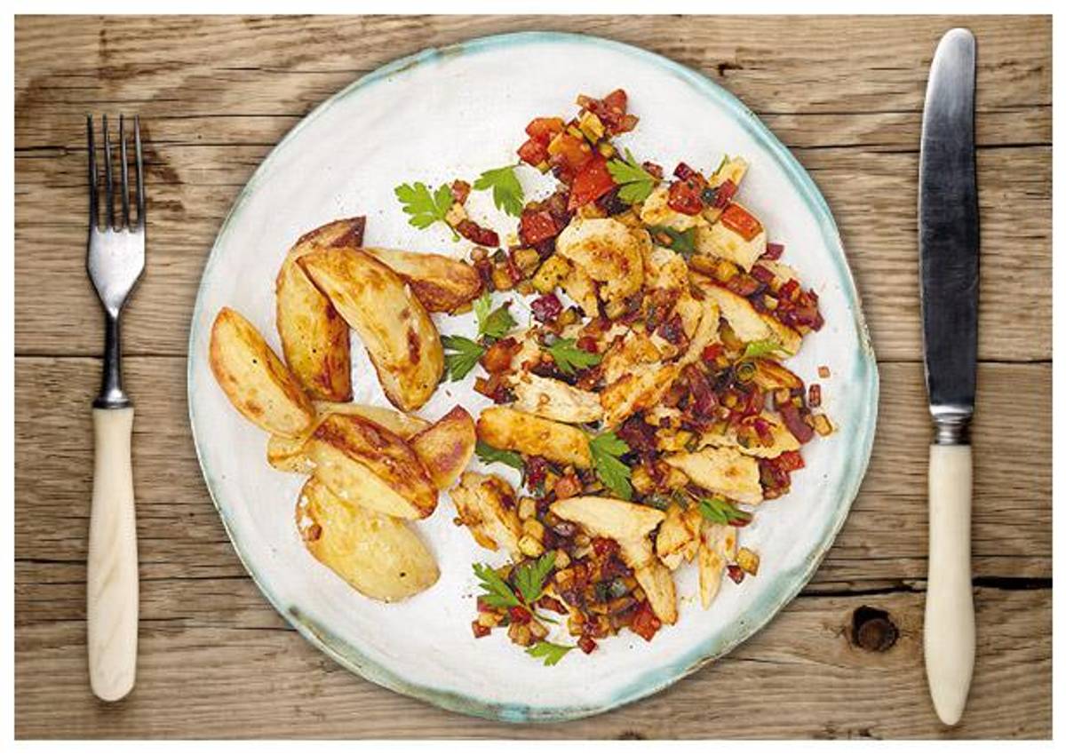 mit Kirschtomaten-Zucchini-Relish und knusprigen Kartoffelwedges