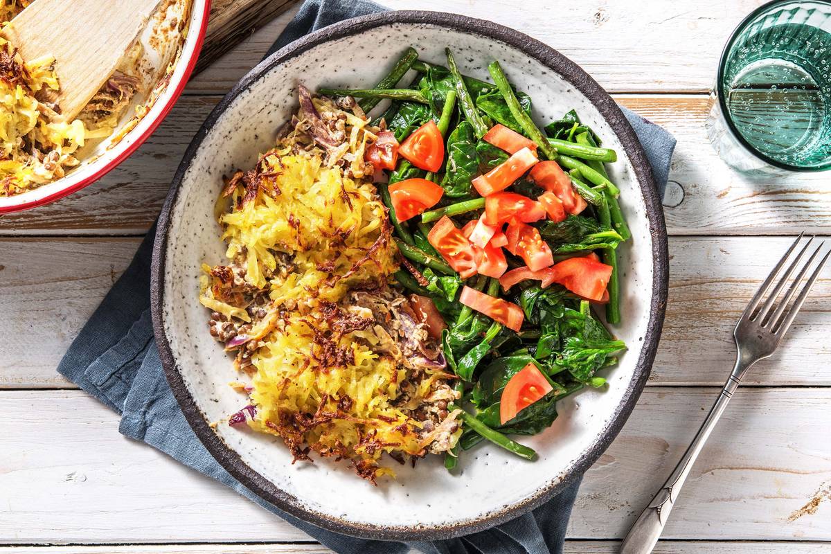 Unsere Köchin Minne hat ein ganz besonderes Rezept für Dich kreiert! Die Kombination aus protein- und ballaststoffreichen Linsen in einer herzhaften Soße, zusätzlich überbacken mit einer leckeren Kartoffelrösti, lässt unsere Herzen höherschlagen. Dazu gibt es ein schnell zubereitetes Bohnen-Spinat-Gemüse, das Du zusätzlich mit dem aromatischen Knoblauch und frischen Tomatenwürfeln verfeinerst. Lass es Dir schmecken!