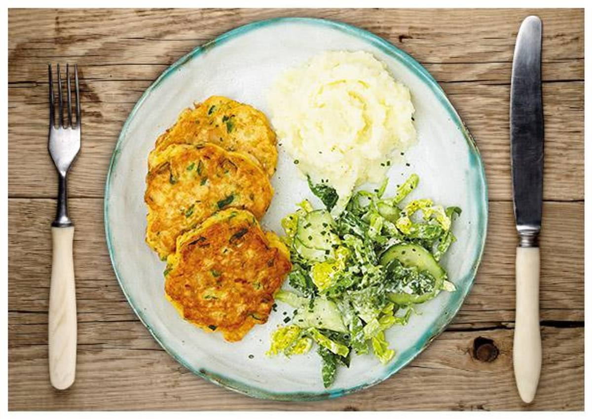 mit Gurkensalat an feinem Joghurtdressing und cremigem Kartoffelpüree