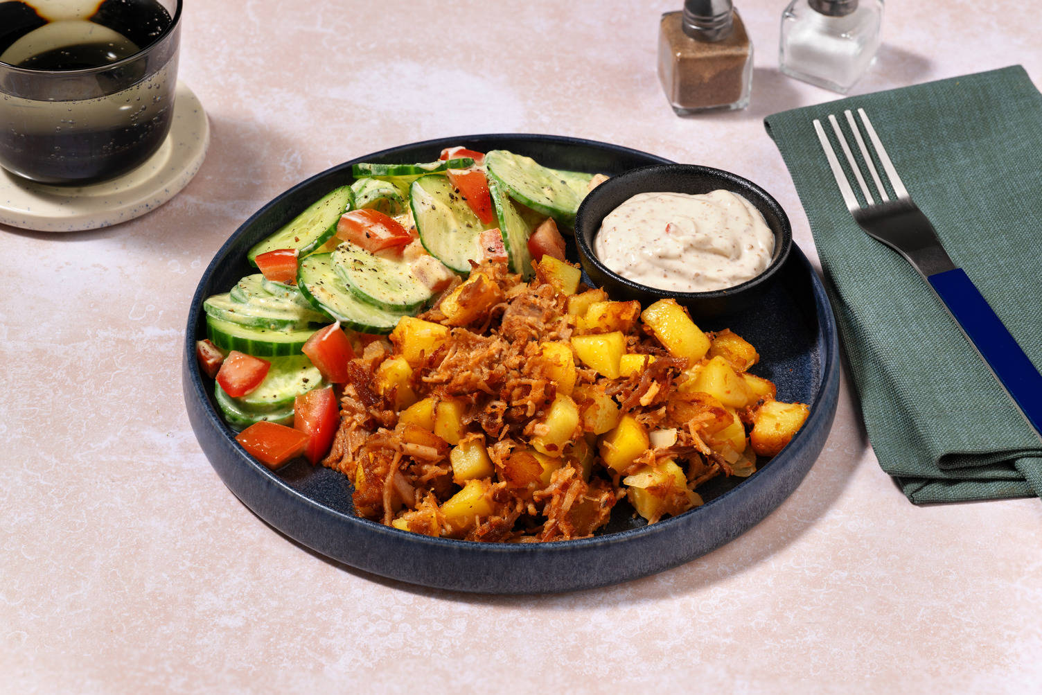 Pulled Pork. Schweinefleisch flüssig und trocken gewürzt, zart gegart, vakuumverpackt. Zutaten: 98% Schweinefleisch flüssig gewürzt (85% Schweinefleisch*, 13% Flüssigwürzung (Trinkwasser, Reisstärke, Rauchsalz (Speisesalz, Buchenholzrauch), Maltodextrin, Speisesalz, Säureregulator: Natriumcarbonate; Stabilisator: Diphosphate; Gewürzextrakte)), 2% Würzung (Tomatenpulver, Speisesalz, Gewürze, Zucker, Gewürzextrakte, Buchenholzrauch). *QS-Ware DE EV 42 EG Lagerung: Gekühlt bei Herkunft: EU, überwiegend Deutschland, Niederlande, Belgien. Inverkehrbringer: HelloFresh Deutschland SE & Co. KG | Prinzenstraße 89 | 10969 Berlin | Deutschland | www.hellofresh.de