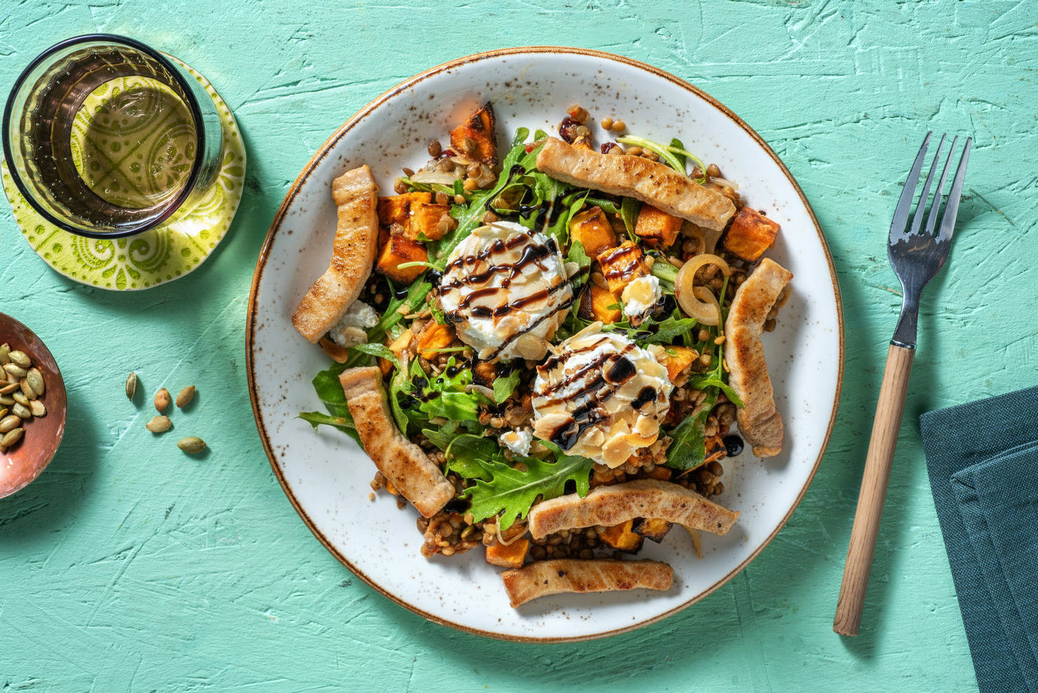 In einer kleinen Schüssel Joghurt, Senf, 1 EL [1,5 EL | 2 EL] Olivenöl*, 1 TL [1,5 TL | 2 TL] Honig*, 1 TL [1,5 TL | 2 TL] Essig*, Salz* und Pfeffer* zu einem Dressing vermengen.