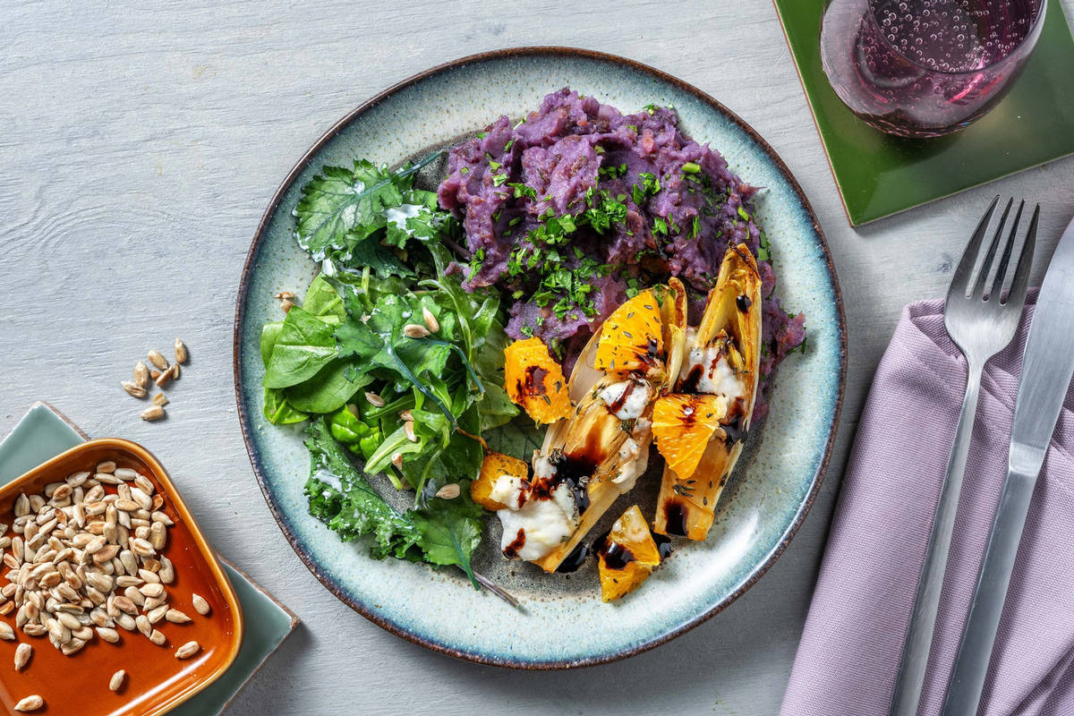 Orangen-Chicorée, lila Karotten-Kartoffel-Stampf und Salat auf Tellern anrichten. Chicorée mit Balsamico-Crème beträufeln, Stampf mit restlicher Petersilie bestreuen und alles zusammen genießen. Guten Appetit!