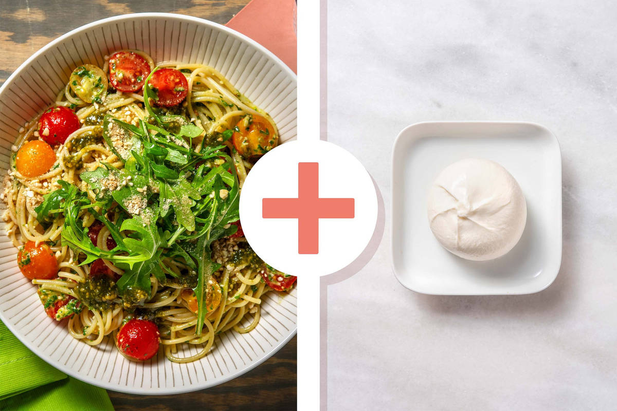 Burrata mit den Händen halbieren. Spaghetti auf Teller verteilen und mit Burrata toppen. Burrata mit restlicher Basilikumpaste beträufeln. Pasta mit restlichem Rucola belegen und mit Cashew-Hefe-Topping bestreuen und genießen. Guten Appetit!
