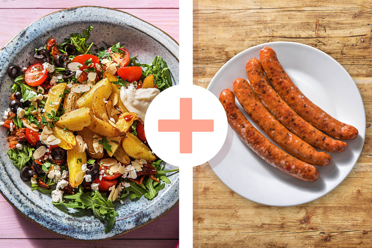 Mit unserem Hello Extra werden Deine sommerlichen Patatas Bravas zu einem ganz besonderen Geschmackserlebnis, denn Dein Extra Leckerbissen dazu sind leckere Chorizo-Bratwürste von Grillido. Mit dabei sind Kartoffeln, Oliven, Hirtenkäse, Rucola und getrocknete Tomaten. Perfekt dazu passt Deine selbst gemachte Aioli, die eine schöne Knoblauchnote mit sich bringt. Wir wünschen Dir guten Appetit – genieß die Sommergefühle!