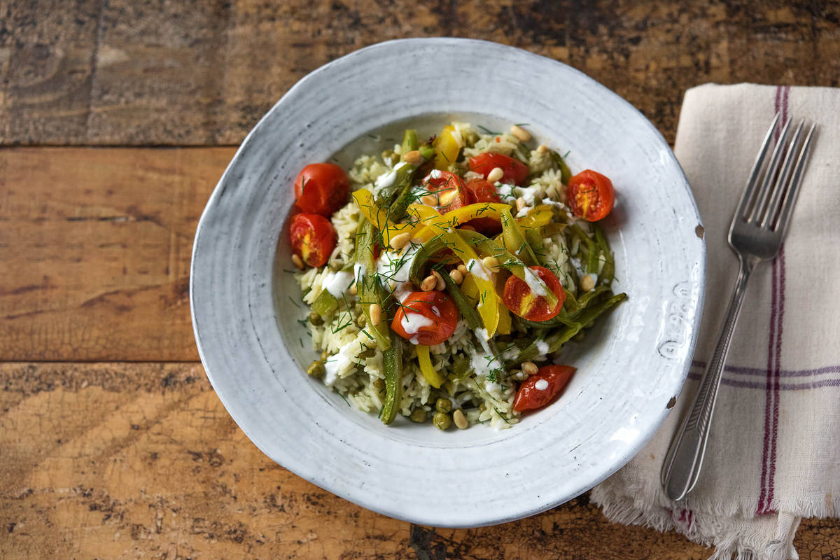 Basmatireis-Pilau nach der Quellzeit mit einer Gabel etwas auflockern und auf Teller verteilen. Geschmortes Gemüse darauf anrichten, mit Pinienkernen und restlichem Dill bestreuen, mit Sahnejoghurt beträufeln und genießen.