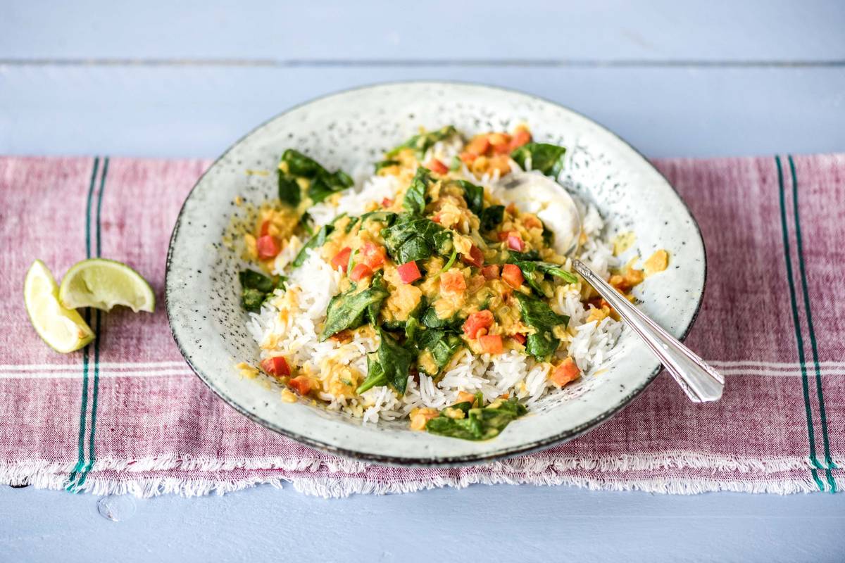 In einem großen Topf 2 TL Öl erwärmen, Zwiebel darin bei schwacher Hitze 8–10 Min. glasig andünsten. Je nach gewünschter Schärfe ½–1 EL gelbe Curry-Paste zugeben und ca. 2 Min. mitbraten, bis alles fein duftet. Paprika und Tomaten zufügen und ca. 5 Min. mitbraten. Linsen zugeben und 1 Min. weiterbraten. Mit Kokosmilch und 200 ml Wasser ablöschen und 15–20 Min. einköcheln lassen, bis Linsen und Gemüse die gewünschte Konsistenz erreicht haben. Für die letzten 1-2 Min. Spinat unterheben und zerfallen lassen. Nach Geschmack mit ein wenig Salz und Pfeffer abschmecken.