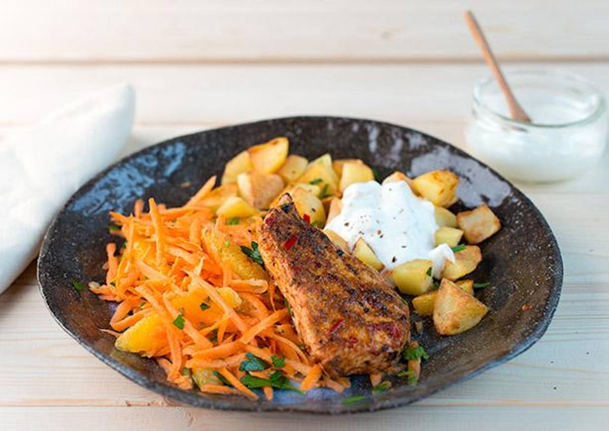 mit knusprigen Kartoffelwürfeln, Limetten-Joghurt-Soße und Karotten-Orangen-Salat