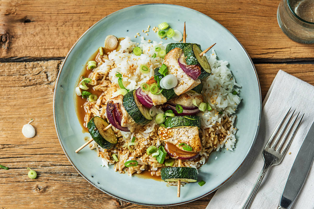 Basmatireis auf Teller verteilen, Puten-Gemüse-Spieße darauf anrichten, mit der Kokos-Soja-Soße beträufeln und mit Sesam und Frühlingzwiebelringen bestreuen.