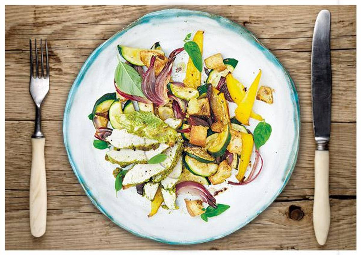 dazu Mediterraner Brotsalat mit gelber Paprika, Zucchini und Parmesanlocken
