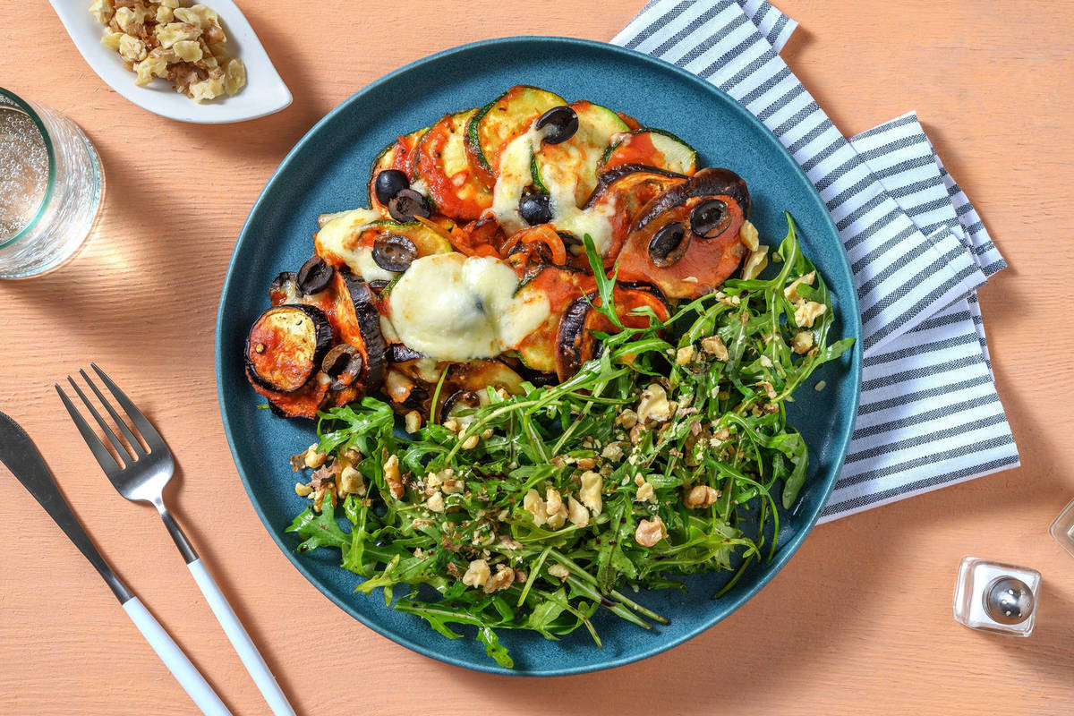 Gehackte Walnüsse, restlichen Hartkäse und Rucola in der großen Schüssel mit dem Dressing mischen. Ratatouille und Salat auf Tellern verteilen und genießen. Guten Appetit!