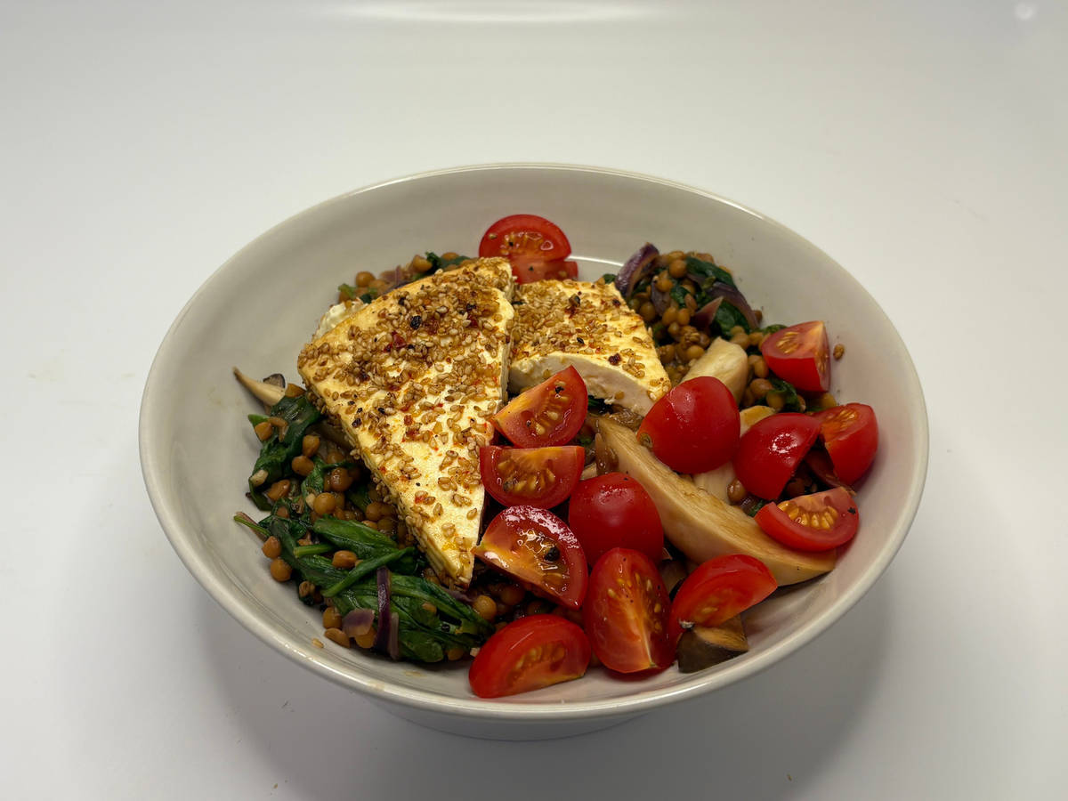 Rauchige Linsenpfanne auf tiefe Teller verteilen, Chili-Sesam-Hirtenkäse darauf anrichten und mit Kirschtomaten toppen. Mit Salz* und Pfeffer* würzen.