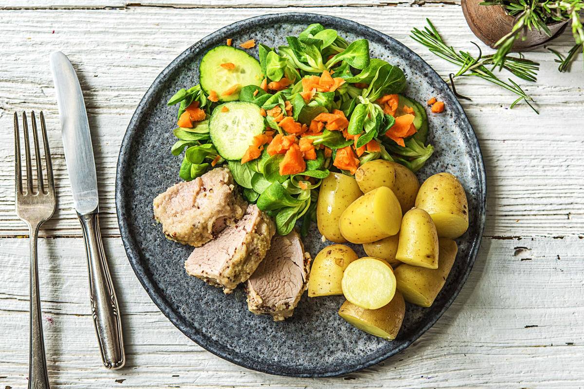 Was ist schon eine Panade gegen diese herrlich pikante Senfkruste, die heute Dein Schweinefilet ziert? Frühlingshaft gibt es dazu goldbraun gebrutzelte Drillinge und einen bunten Salat, der voller Vitamine und Mineralstoffe steckt. Lass Dir dieses ballaststoffreiche Gericht schmecken.