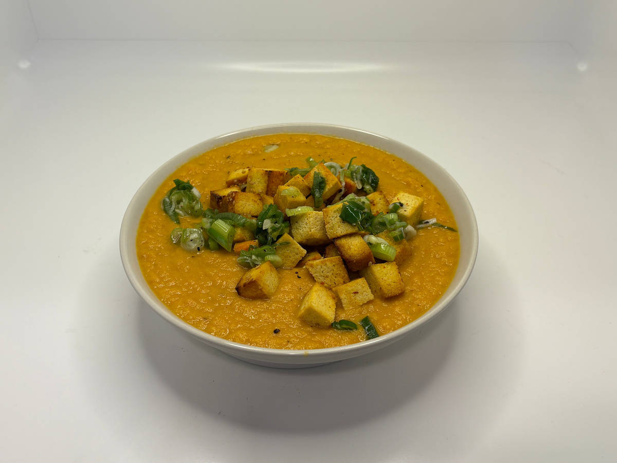 Suppe auf tiefe Teller verteilen, Tofu darauf anrichten und mit dem Limetten-Topping und Sesam garnieren.