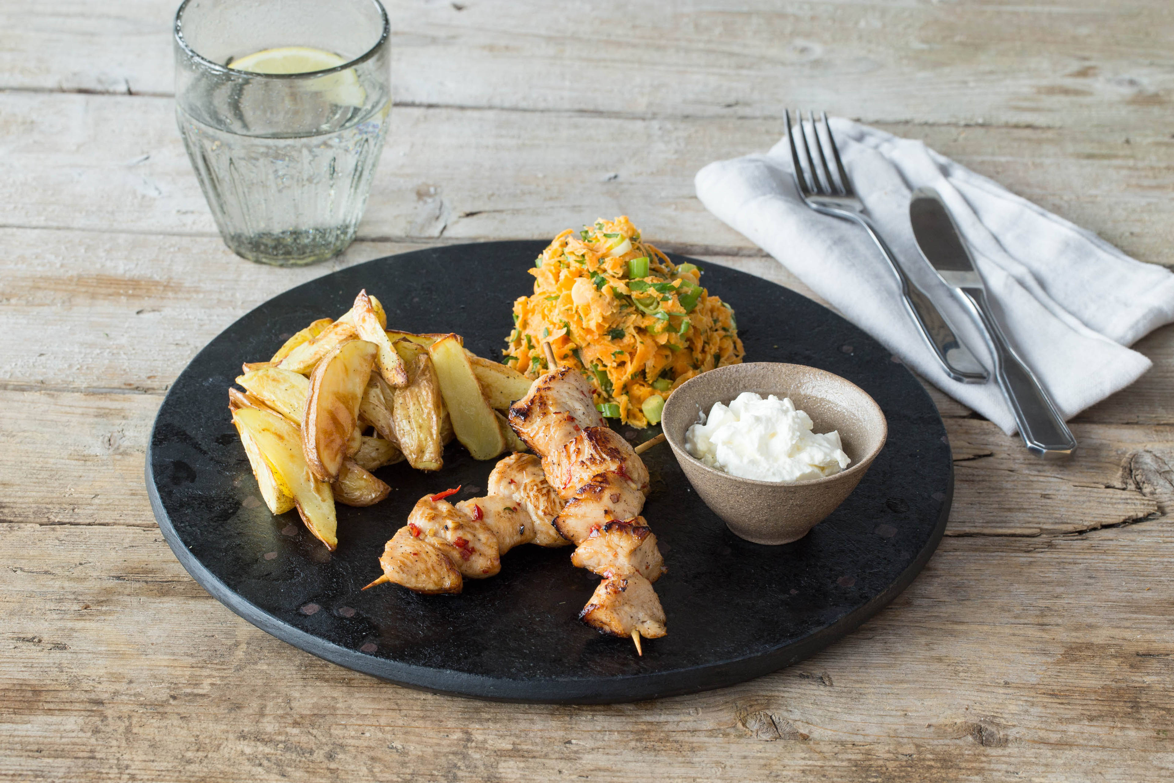Kartoffeln, Würstchen, Gemüse und Dip auf Tellern anrichten und genießen.
