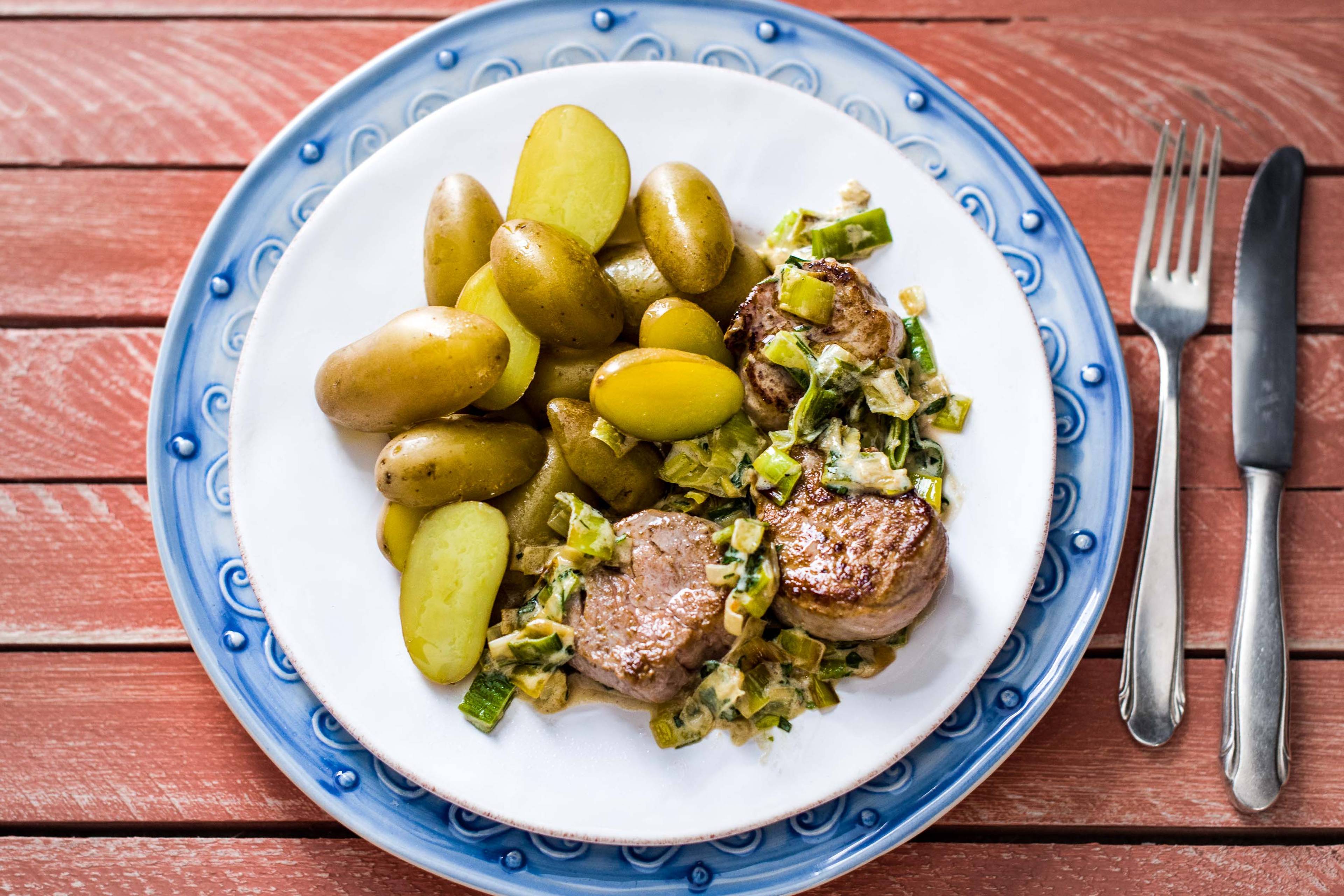 Aus der Pfanne nehmen und in den letzten 12 Min. der Kartoffelgarzeit mit auf das Backblech geben, bis das Fleisch innen noch leicht rosa ist.