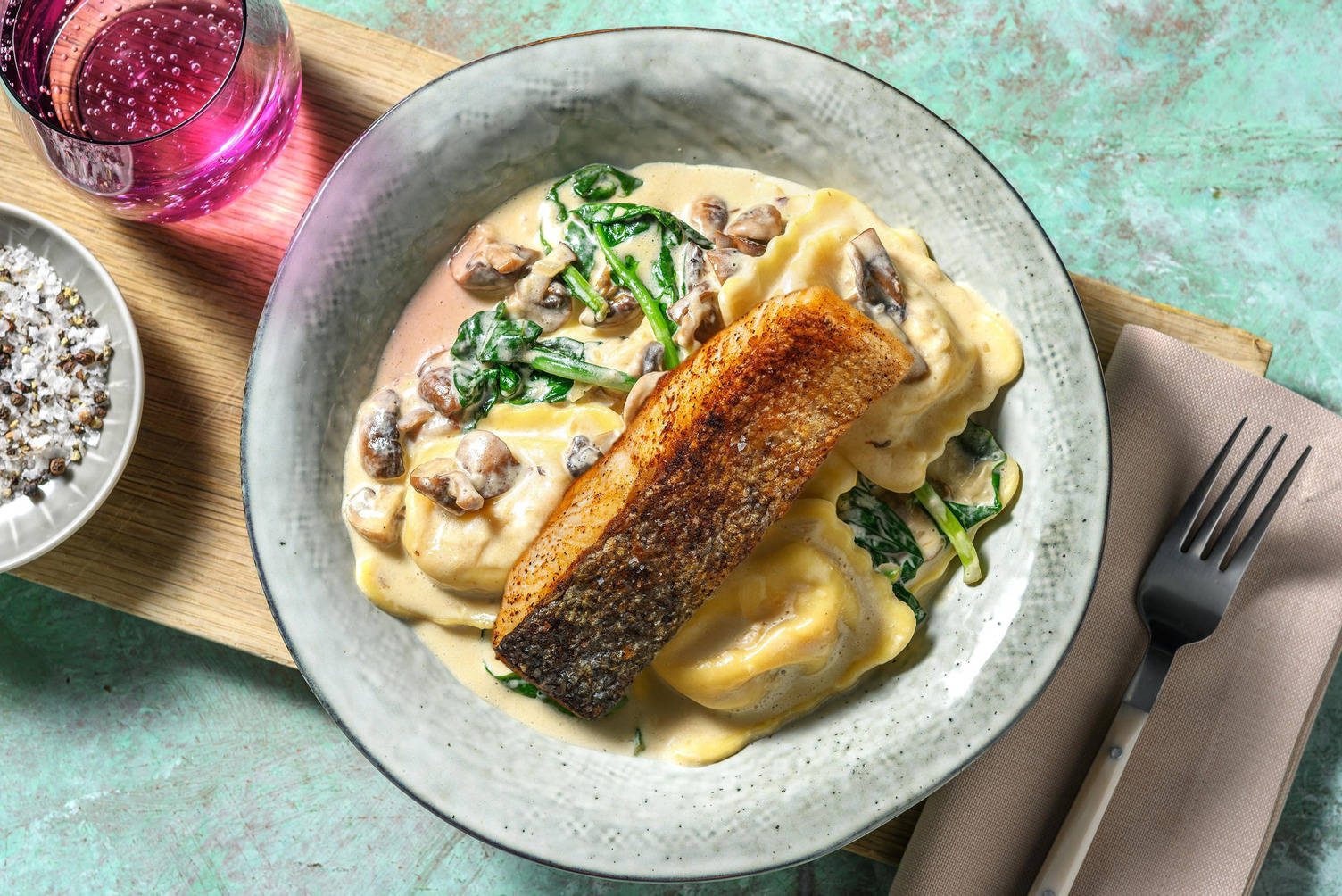 Schmand unterrühren, mit Muskatnuss, Salz und Pfeffer abschmecken. Falls die Soße zu dick wird, etwas Wasser hinzufügen.
